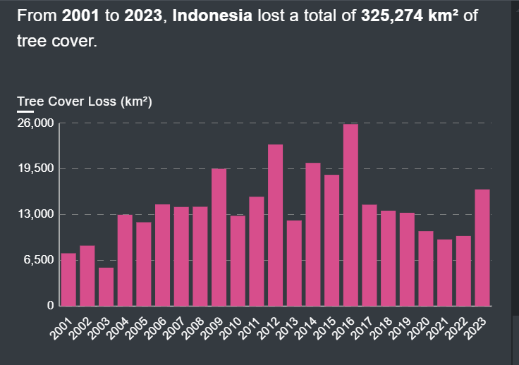 Dari tahun 2001 hingga 2023, Indonesia menghadapi tantangan lingkungan yang signifikan: hilangnya tutupan hutan yang berharga. Selama 22 tahun ini, negara menyaksikan deforestasi yang mengkhawatirkan, sebesar 325.274 km² hutan menghilang – luas yang lebih besar dari banyak negara. Angka tersebut menunjukkan terjadi deforestasi seluas 14.785 km² per tahun atau 40,51 km² per hari atau dalam setiap menit, terjadi deforestasi setara dengan sekitar 3,94 kali luas lapangan sepak bola.