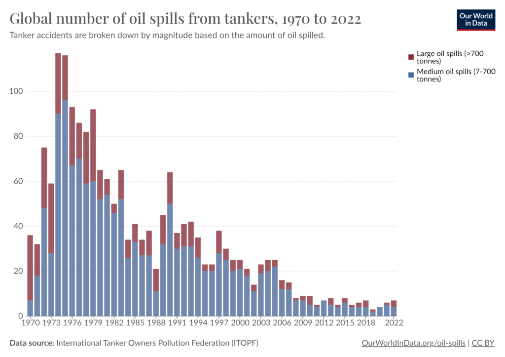Namun, sejak itu, ada penurunan drastis dalam insiden tersebut. Pada dekade terakhir, insiden tumpahan minyak telah berkurang secara signifikan dengan jumlah yang jauh lebih rendah dibandingkan dengan era sebelumnya.